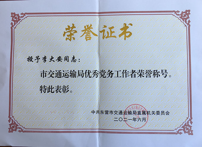 李大安榮獲“市交通運(yùn)輸局優(yōu)秀黨務(wù)工作者”